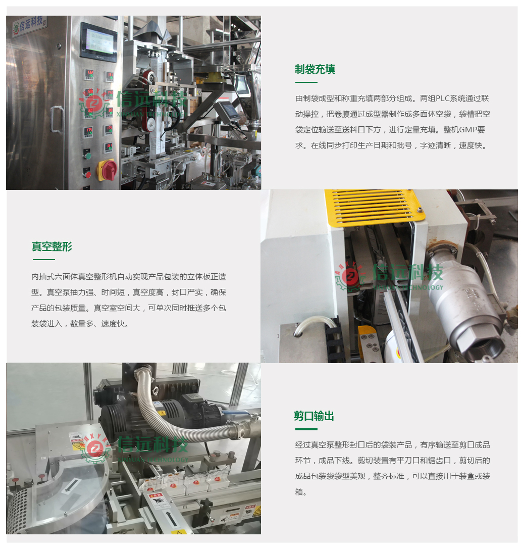 適合100-1000g粉狀物料或顆粒物料的鋁箔膜袋、復(fù)合膜袋的真空包裝生產(chǎn)。包裝檔次高,包裝速度快,標(biāo)準(zhǔn)化程度高,成品質(zhì)量有保障,利于運(yùn)輸、流動(dòng)、交易和貯存。